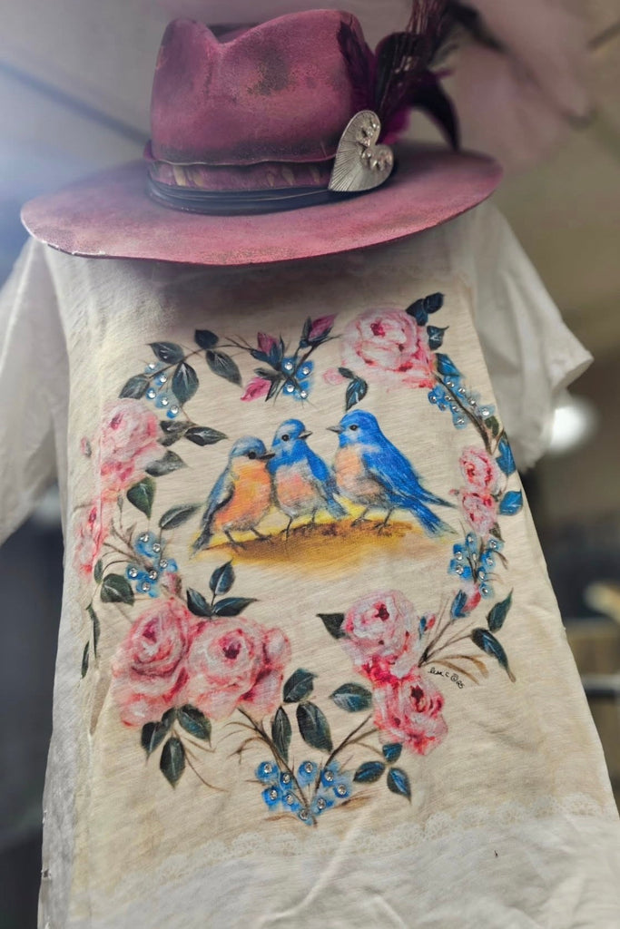 This beauty is full of charm and artistry. Made in the USA from 100% cotton, this top features a stunning hand-illustrated songbird and floral design that feels romantic, soulful, and effortlessly wearable.