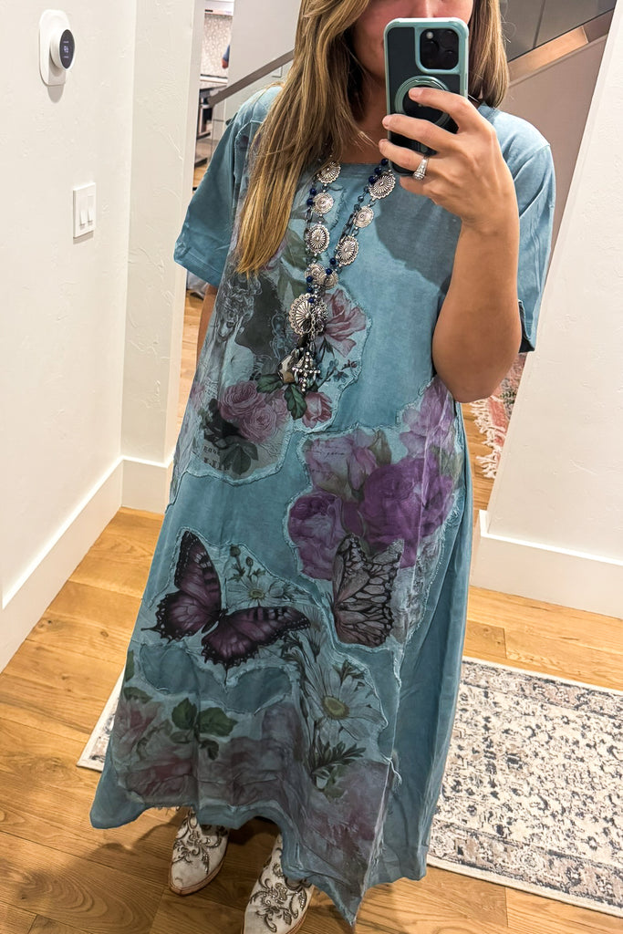 The artistic botanical and butterfly details give it a wearable-art feel, perfect for everything from casual days to dressed-up moments. Whether styled with boots, sandals, or statement jewelry, this dress transitions beautifully for any occasion.