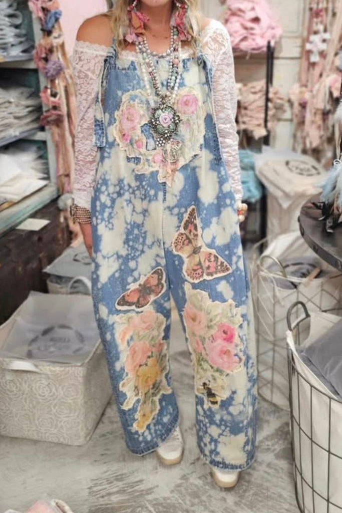 These one-of-a-kind patchwork denim overalls are full of charm, whimsy, and effortless style. Featuring soft vintage-inspired florals, butterfly details, and a dreamy washed denim look, they’re made to be styled your way — just like this darling pink scarf + pink lace top combo 🌸