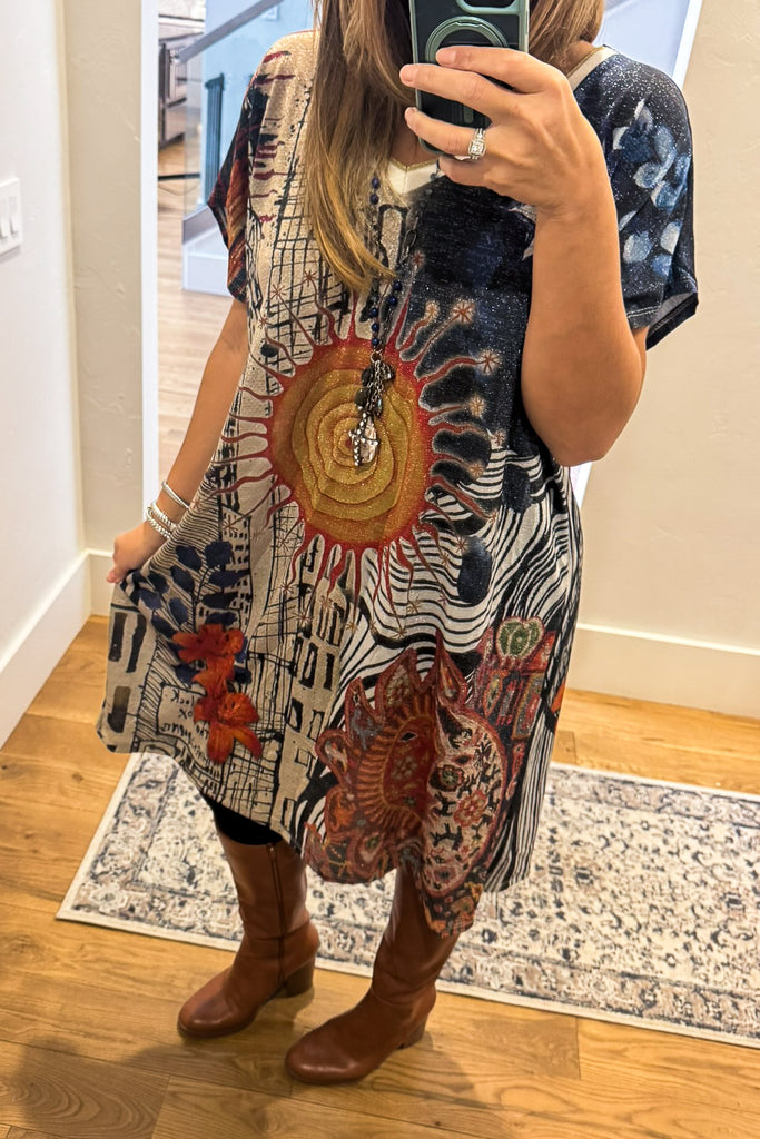This Italian-made graphic tunic dress is wearable art. Bold, expressive, and effortlessly chic, it features a striking sunburst design mixed with abstract patterns and rich, earthy tones that make a statement without trying too hard.