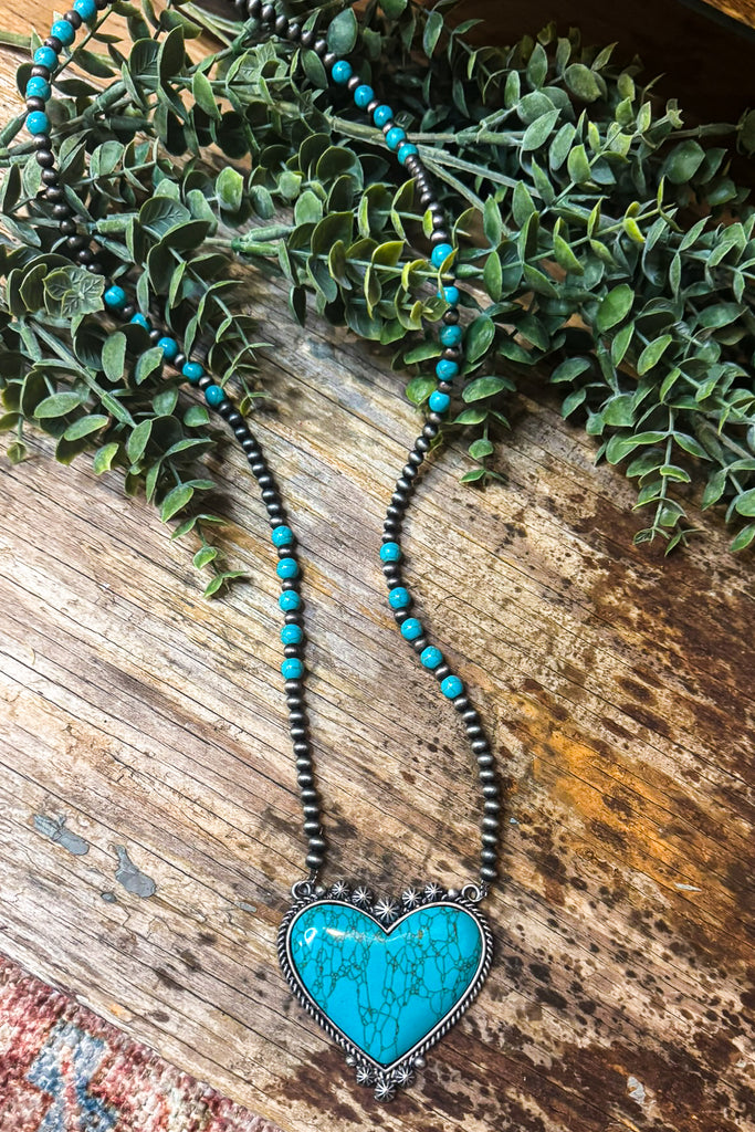A stunning turquoise heart pendant paired with a classic beaded chain for the perfect southwest touch. This necklace is bold yet easy to wear and makes a beautiful statement on its own or layered with your favorites.