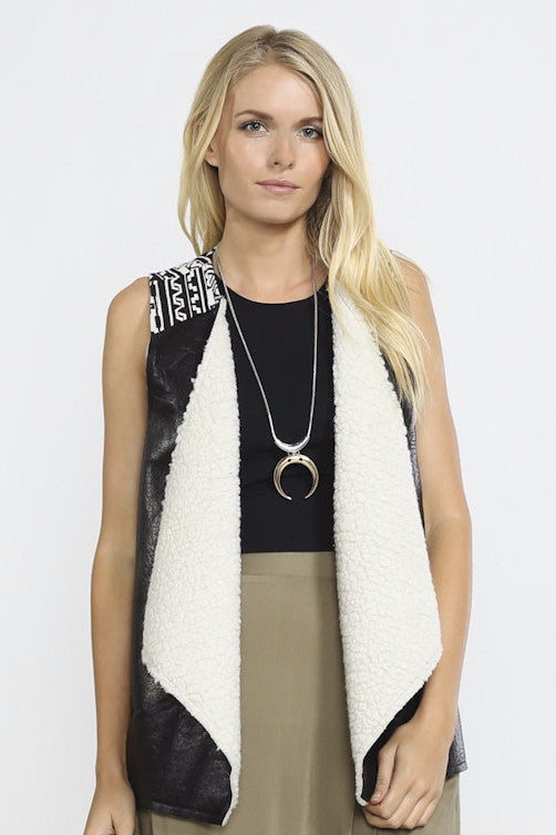Perfect leather fur cardigan/vest for fall and winter. Black color vest with an Aztec print design details.