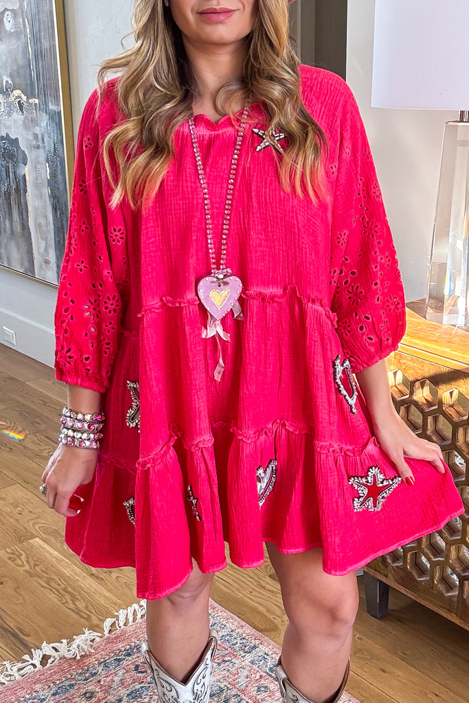 The sweetest statement dress with the most charming details. This bright cotton dress features eyelet sleeves and whimsical patch accents including hearts and stars for that wearable art look.